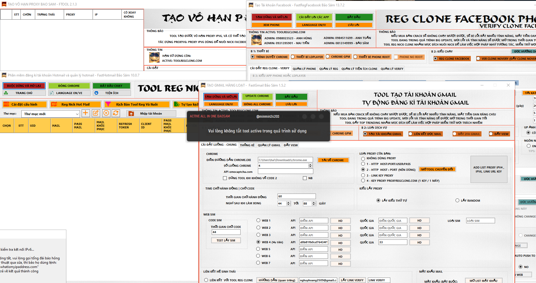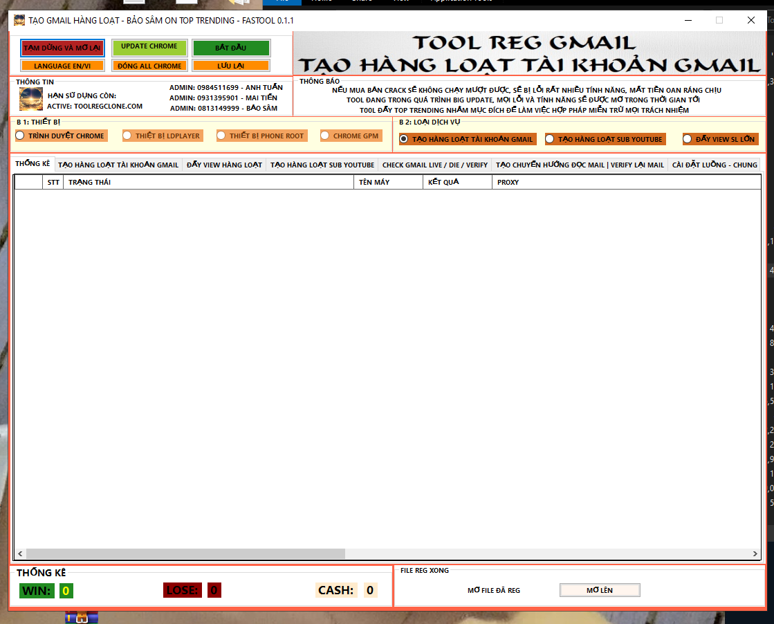 Tool Reg Gmail Bảo Sâm 1 Máy, Chrome, LD, Phone