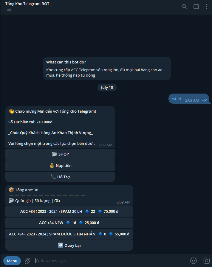 BOT Telegram Shop Bán Acc Telegram, Proxy, nạp tiền auto